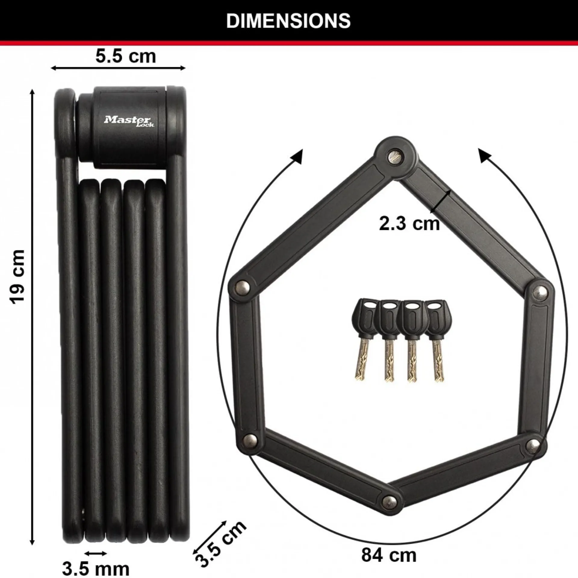 The Master Lock No. 8335 Folding Bike Lock is 2-3/4ft (84cm) long and features 3.5mm diameter hardened steel links, offering resistance to cutting and sawing. Each link is bound by stainless steel rivets to offer maximum pry resistance. The vinyl cover helps prevent scratching. The hardened steel body offers maximum strength and reliability. The Velcro carrier bracket is easy to install and provides convenient storage. Insured with the Limited Lifetime Warranty providing peace of mind from a brand you can trust.