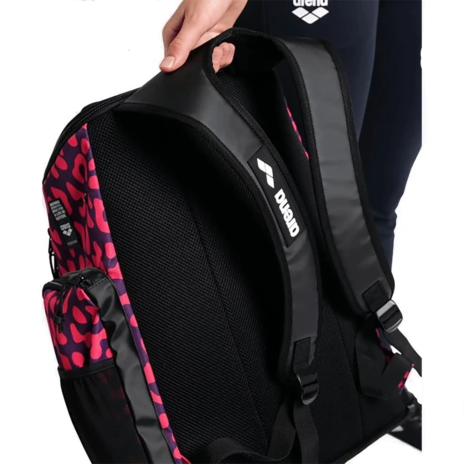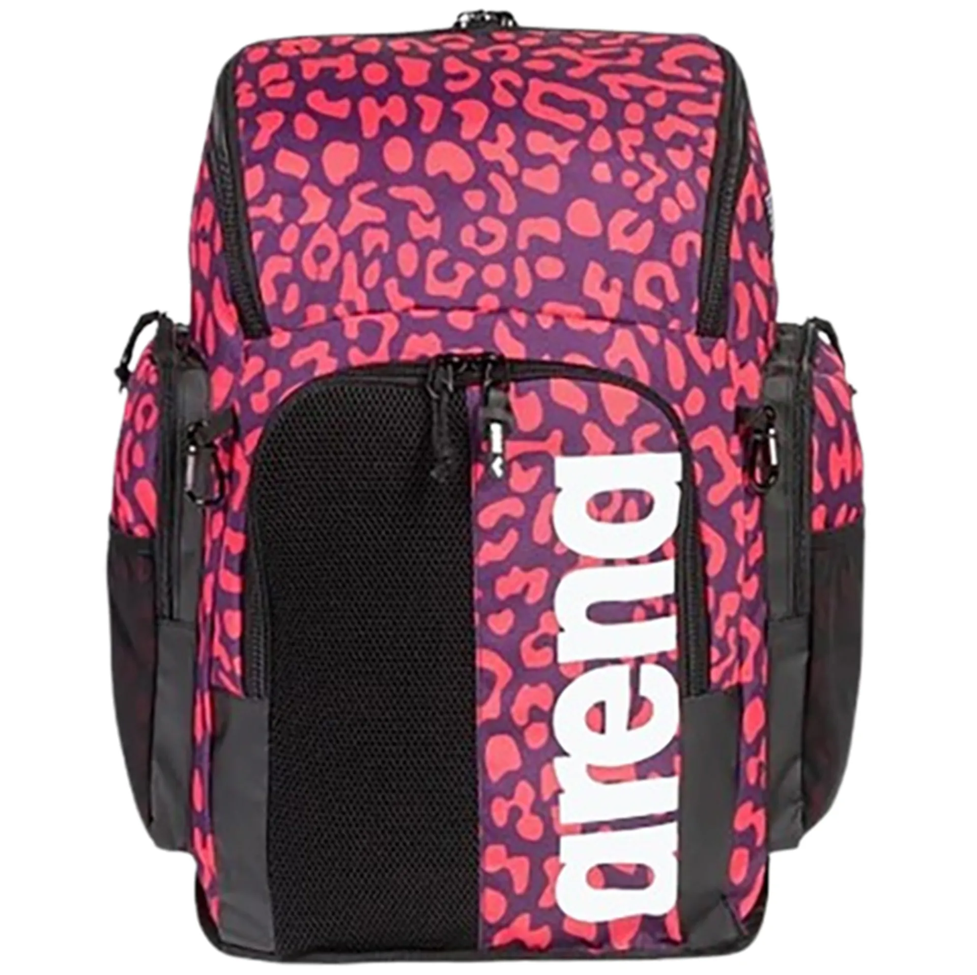 The sporty Arena Backpack Spiky III 45L is ideal for carrying training gear or for school and leisure time. Equipped with water repellent bottom to protect your belongings. Two roomy main compartments and a front zip pocket offer excellent storage options. The additional mesh side pockets are perfect for water bottles or other gear. Breathable mesh inserts, the breathable back panel and adjustable padded shoulder straps guarantee outstanding comfort.