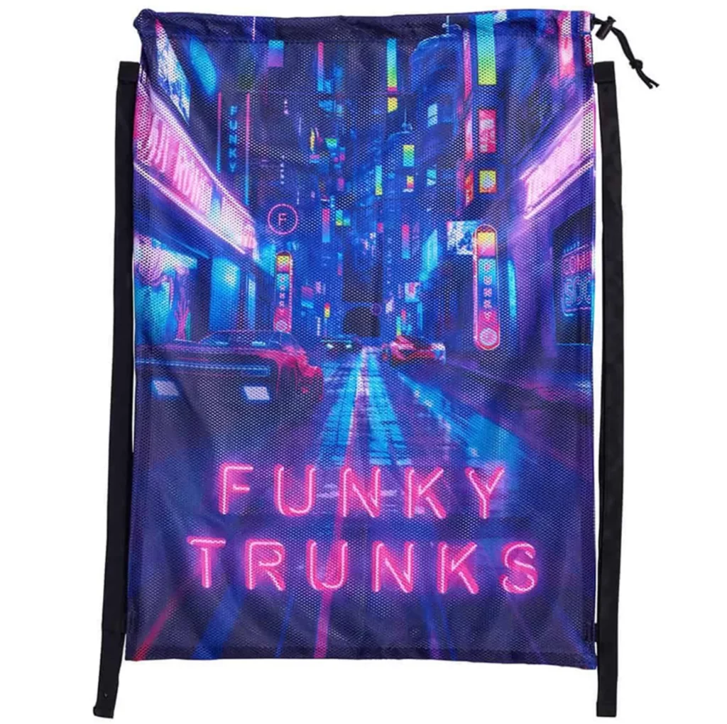 - Mesh Bag. A kit bag is an essential for activities such as swimming, and we just love this Funky Trunks Mesh Gear Bag Cyber City drawstring bag that is designed with the environment in mind. This is a unique, eye-catching design that is made with the latest direct digital printing technology to reduce wastage and water consumption in the printing process. It’s a great way to store swimming gear and training aids, and is an excellent gift idea for trainee swimmers.