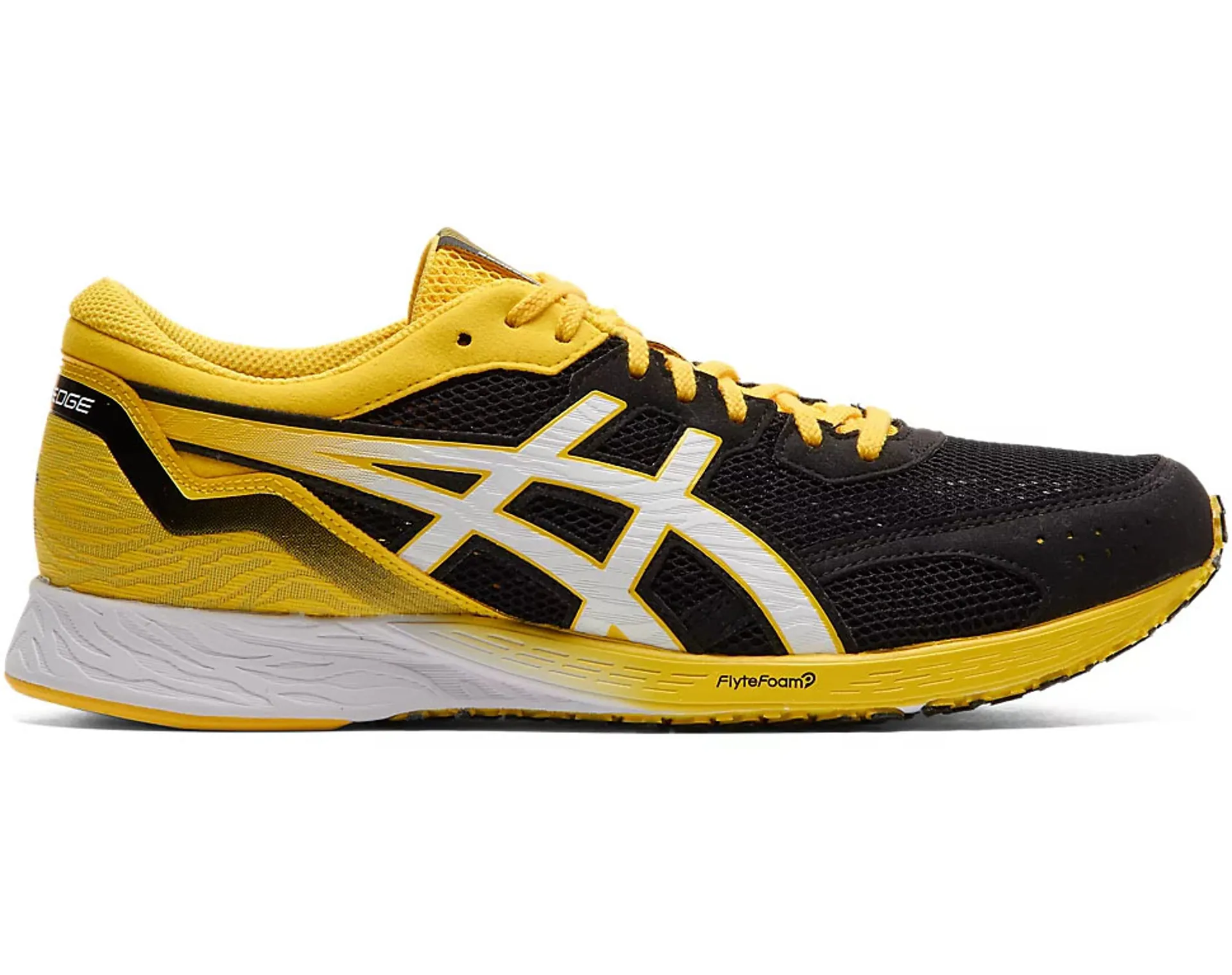 Run like the wind in the men's TARTHEREDGE™ performance running shoe by ASICS, a specially designed sprinting shoe with an incredibly lightweight feel. Designed to help you achieve your best time yet, this ASICS design combines style, comfort and stability.Stamped with a stylish design for a contemporary look, the TARTHEREDGE™ shoe puts a spring in your step with its SpEVA sockliner, which improves bounce-back characteristics. At the same time, its DUOSOLE construction offers lightweight flexibility and traction to help you go further, while an internal heel counter gives an adaptive fit for further improved comfort. FLYTEFOAM® Propel technology has also been included - this lightweight foam formulation has a high-energy return elastomer, for excellent bounce and unrivalled toe-off.Crafted with jacquard mesh fabric to allow your feet to breathe, this hardwearing shoe also features a molded AHAR® heel plug to reduce excessive wear as well as TRUSSTIC SYSTEM® technology for stability with every stride.Whether you're a competitive racer or simply like challenging yourself to beat your personal best, the TARTHEREDGE™ shoe is a dynamic choice, helping you speed to the finish line with ease and confidence. Weight: 184 g/6.5 oz Heel Drop: 10 mm