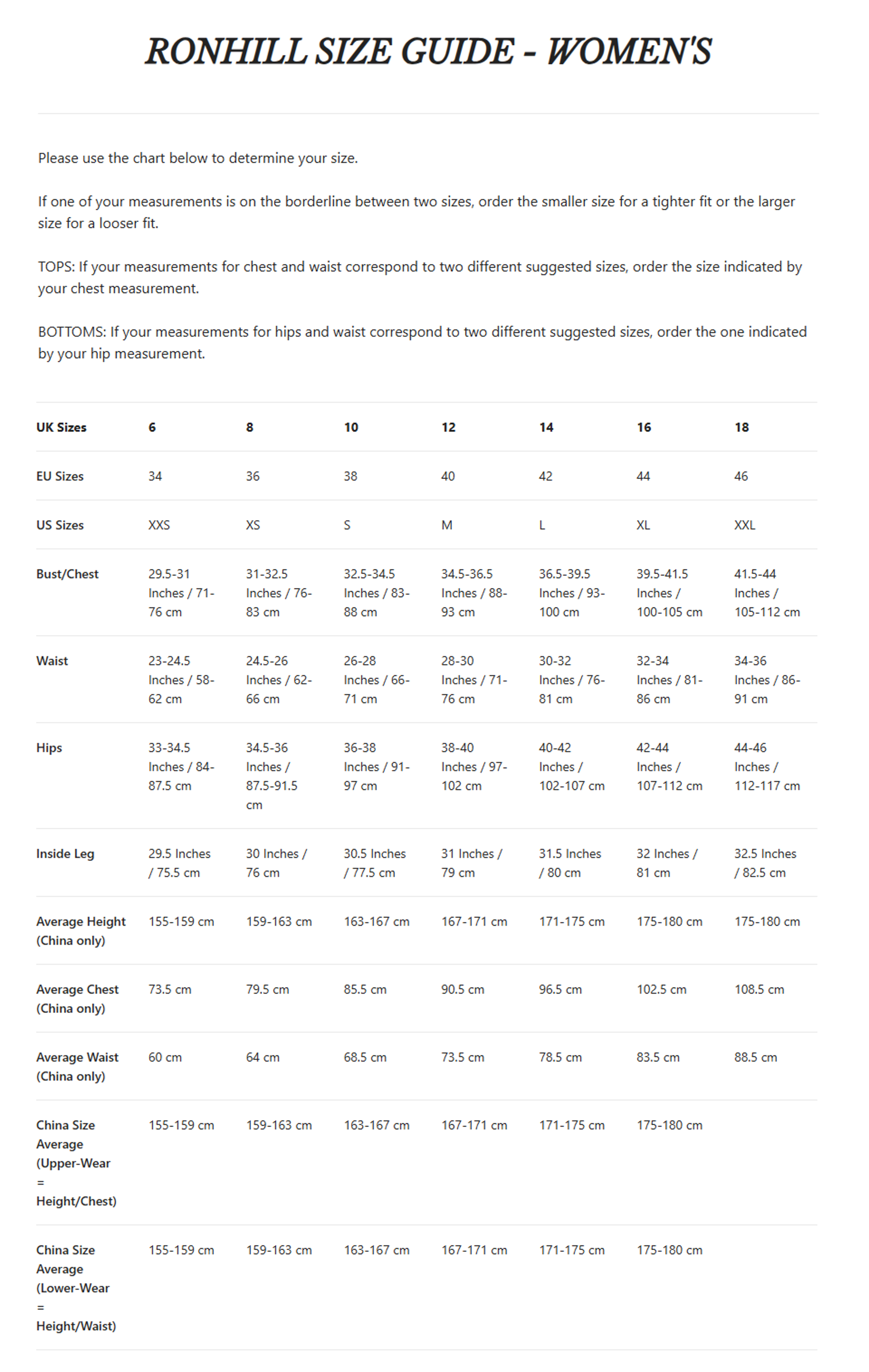 Sizing Information