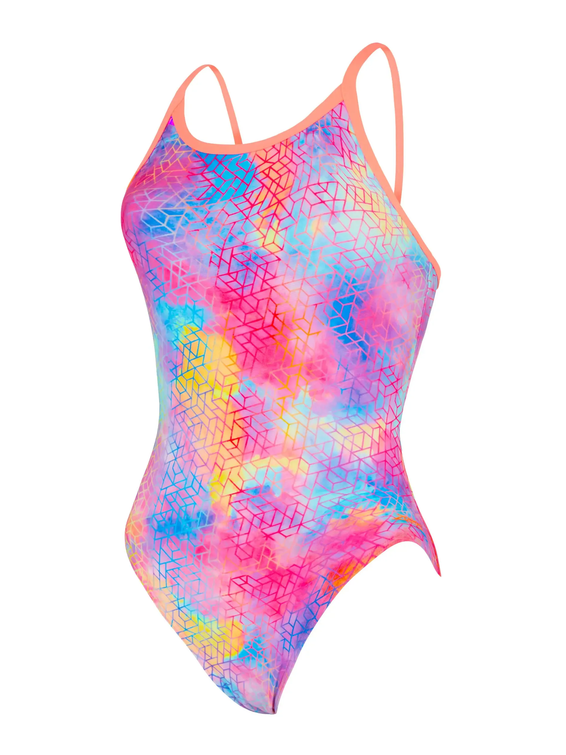 The kind of swimsuit you dream about - Zoggs Paradox Sprintback! The colourful cloud design is overlayed with a geometric pattern. With contrasting neon coral straps, this suit makes a splash every swim.